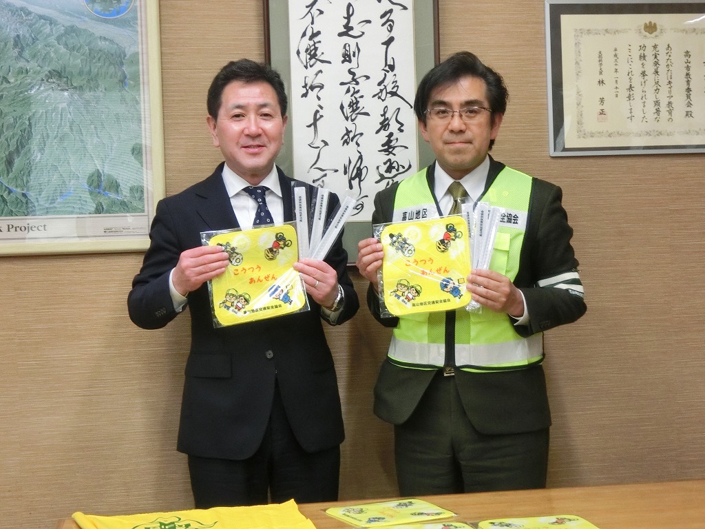 2026.3.19 高山地区交通安全協会は例年、小学校新入学児童全員に交通安全ハンドタオルを、中学校新入学生徒全員にリストバンド型リフレクターを贈呈しており、高山市教育委員会・見山教育長への贈呈式を行いました。